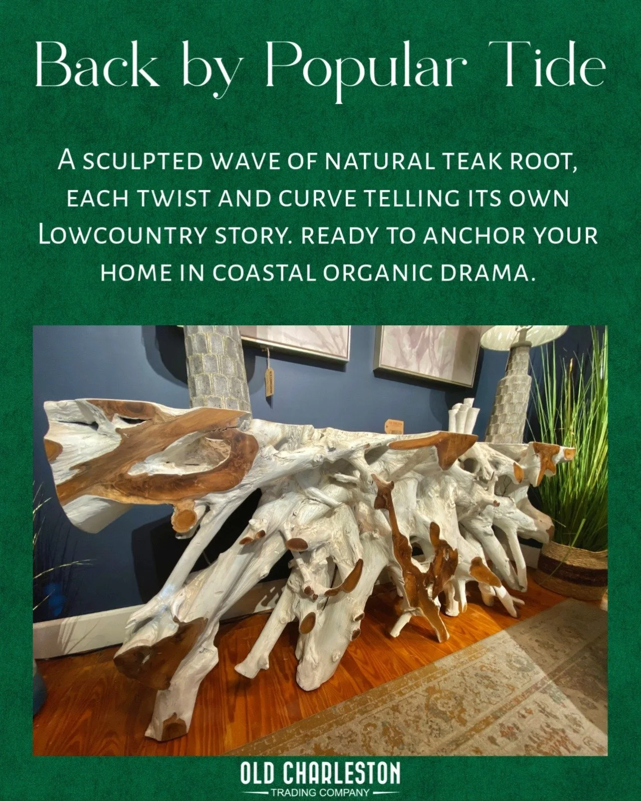 Old Charleston Trading Company is your Johns Island furniture destination for reclaimed & sustainable solid-wood pieces; think mango, acacia, teak, and parotta wood furniture alongside coastal décor, lighting, mirrors, pillows, rugs, including locally made - pottery, fused-glass art, photography and much more. The posts above pull from our live Instagram feed to highlight fresh arrivals and restocks: Dining tables, consoles, sideboards, media units, desks, bar & counter stools, unique lamps, and locally created artisan accents inspired by the Lowcountry.
